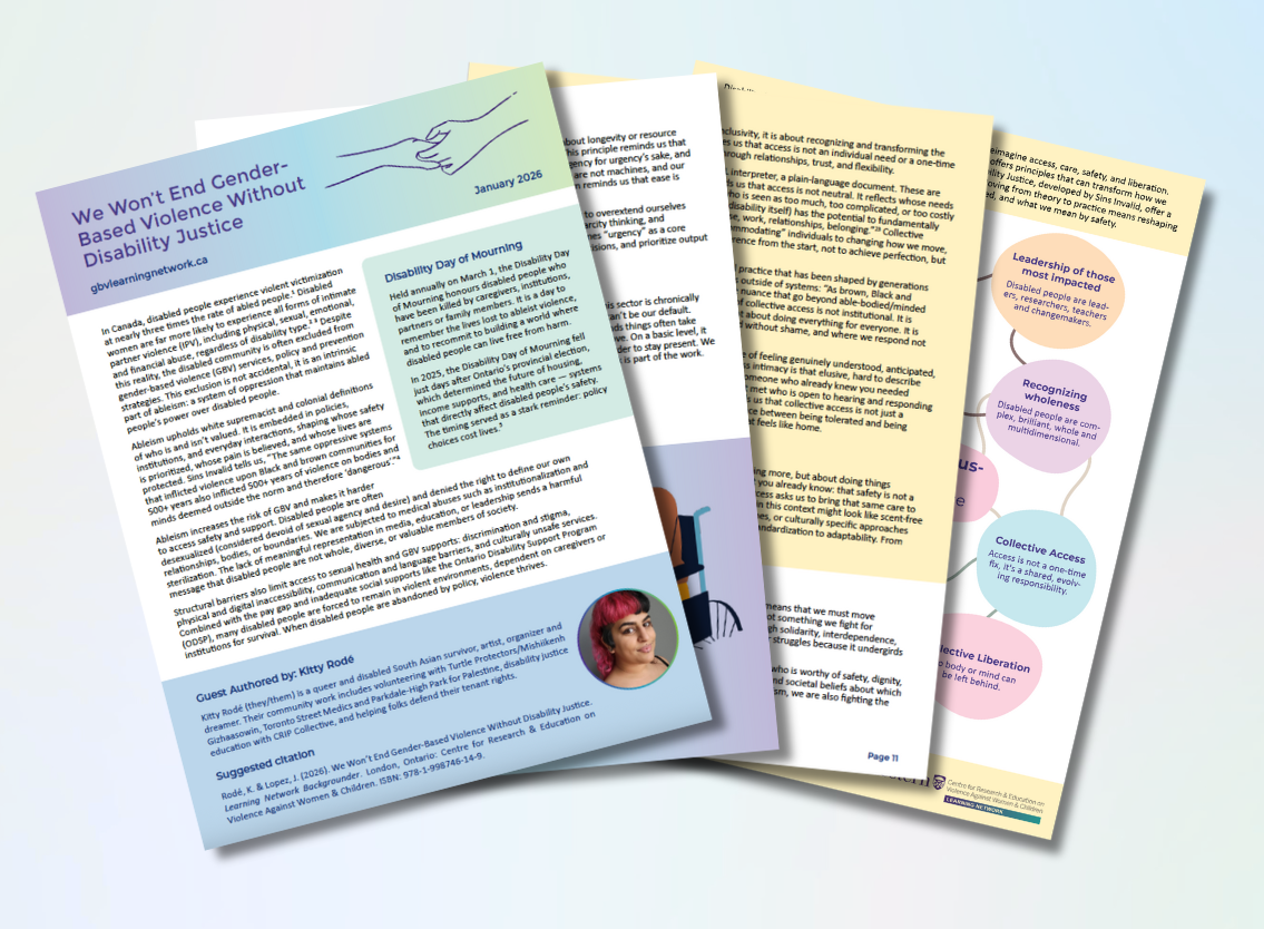 This Backgrounder focuses on disabled wisdom and innovation, not as mere inspiration, but as essential infrastructure for justice work. Disability Justice (DJ) is a movement and a framework that positions disability as a political and collective experience shaped by systems of oppression and generations of resistance. Also included is a companion Infographic, Practicing Disability Justice in GBV Work: 10 Principles in Practice, offering a practical snapshot of key concepts for day-to-day learning and reflection.