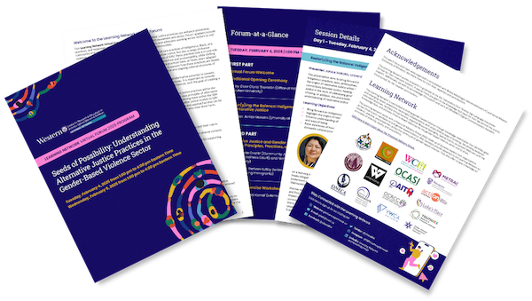 This Virtual Forum provided an opportunity to learn more about alternative justice practices within the context of GBV work in Canada. Diverse speakers focused on the history and core principles of alternative justice practices and shared the strategies, challenges and opportunities for advancing them within the GBV sector and movement. Speakers also highlighted existing and emerging alternative justice models to GBV that centre Indigenous, Black and racialized communities, offering practical tools and approaches that can be integrated into your everyday work supporting survivors, communities, and those who have done harm.