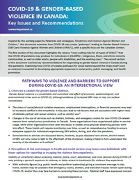 This document examines how COVID-19 may create pathways and barriers leading to gender-based violence and violence against women and children. It highlights key recommendations for responding to these issues, with a specific focus on the Canadian context.