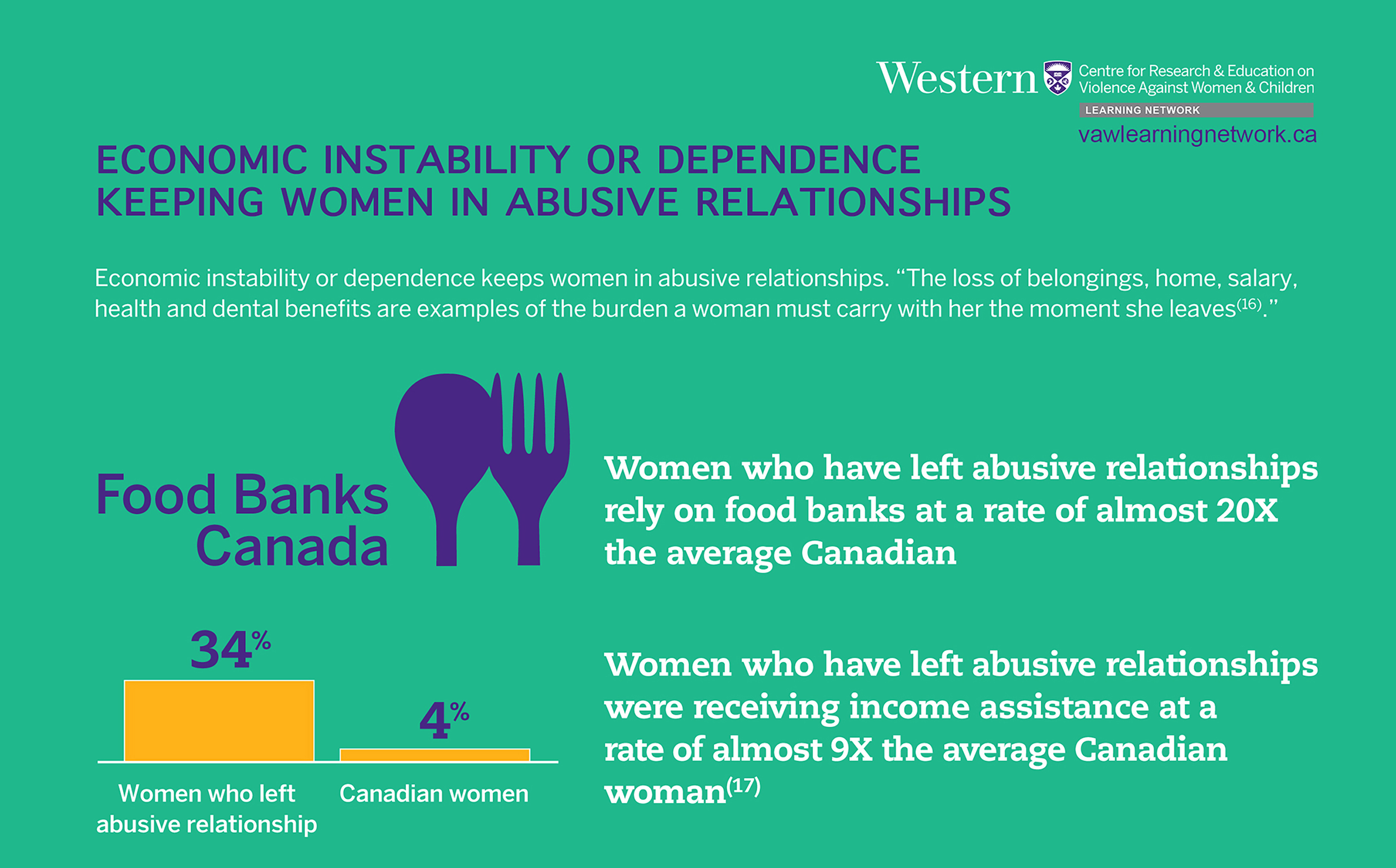 - Food Banks Canada: Women who have left abusive relationships rely on food banks at a rate of almost 20X the average Canadian