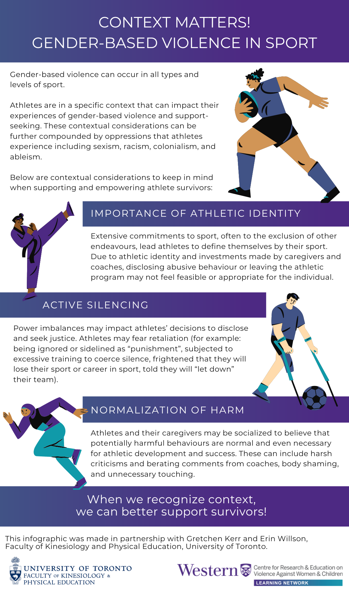 Athletes are in a specific context that can impact their experiences of gender-based violence and support-seeking. These contextual considerations can be further compounded by oppressions that athletes experience including sexism, racism, colonialism, and ableism.