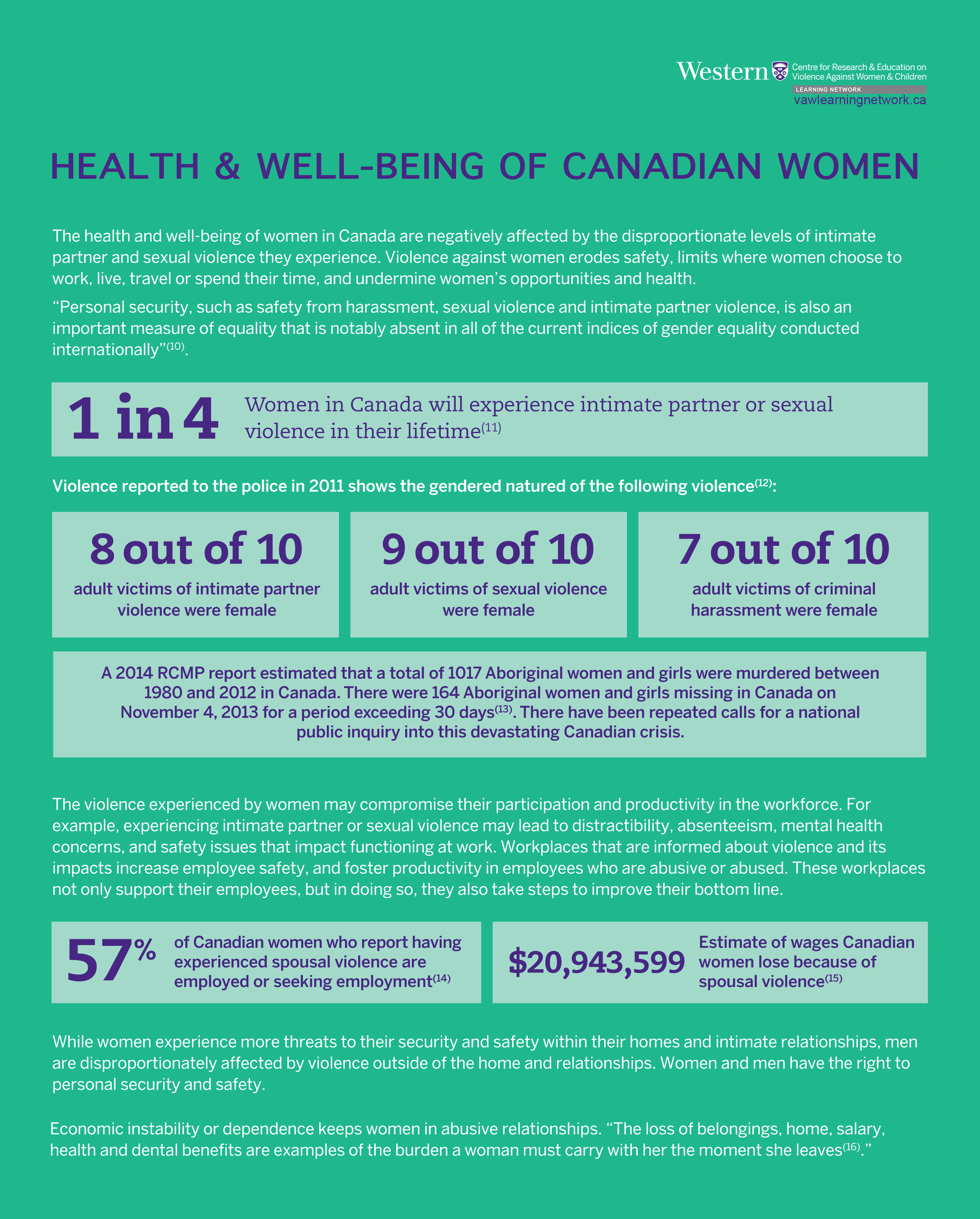 57% Canadian women who reports having experienced spousal violence are employed or seeking employment. $20,943, 599 Estimate of wages Canadian women lose because of spousal violence.