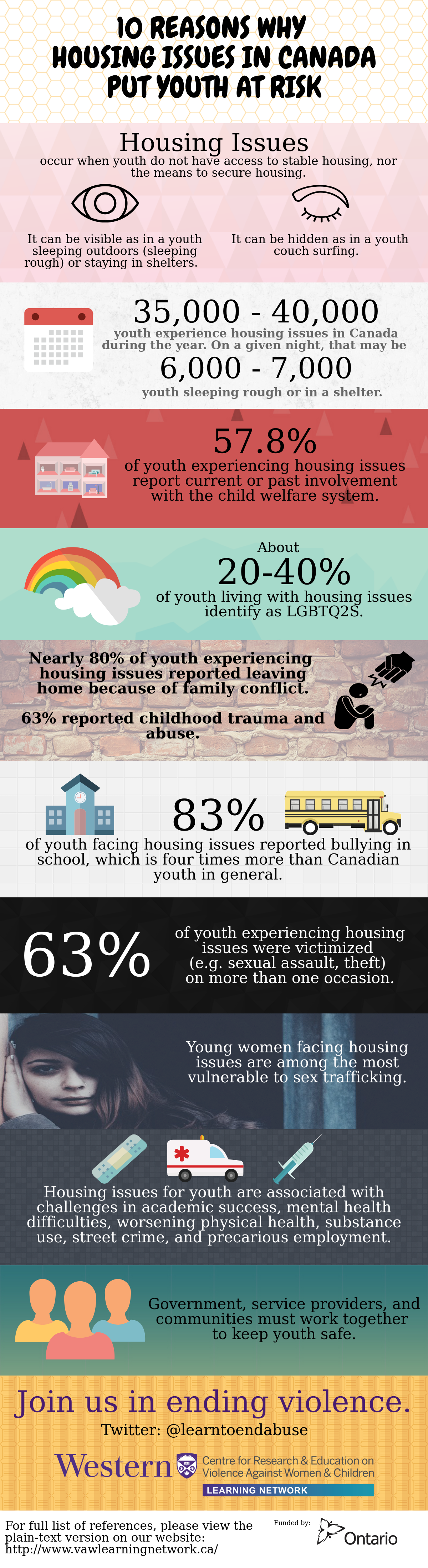 Housing issues for youth are associated with challenges in academic success, mental health difficulties, worsening physical health, substance use, street crime, and precarious employment.ix Government, service providers, and communities must work together to keep youth safe. Join us in ending violence. i