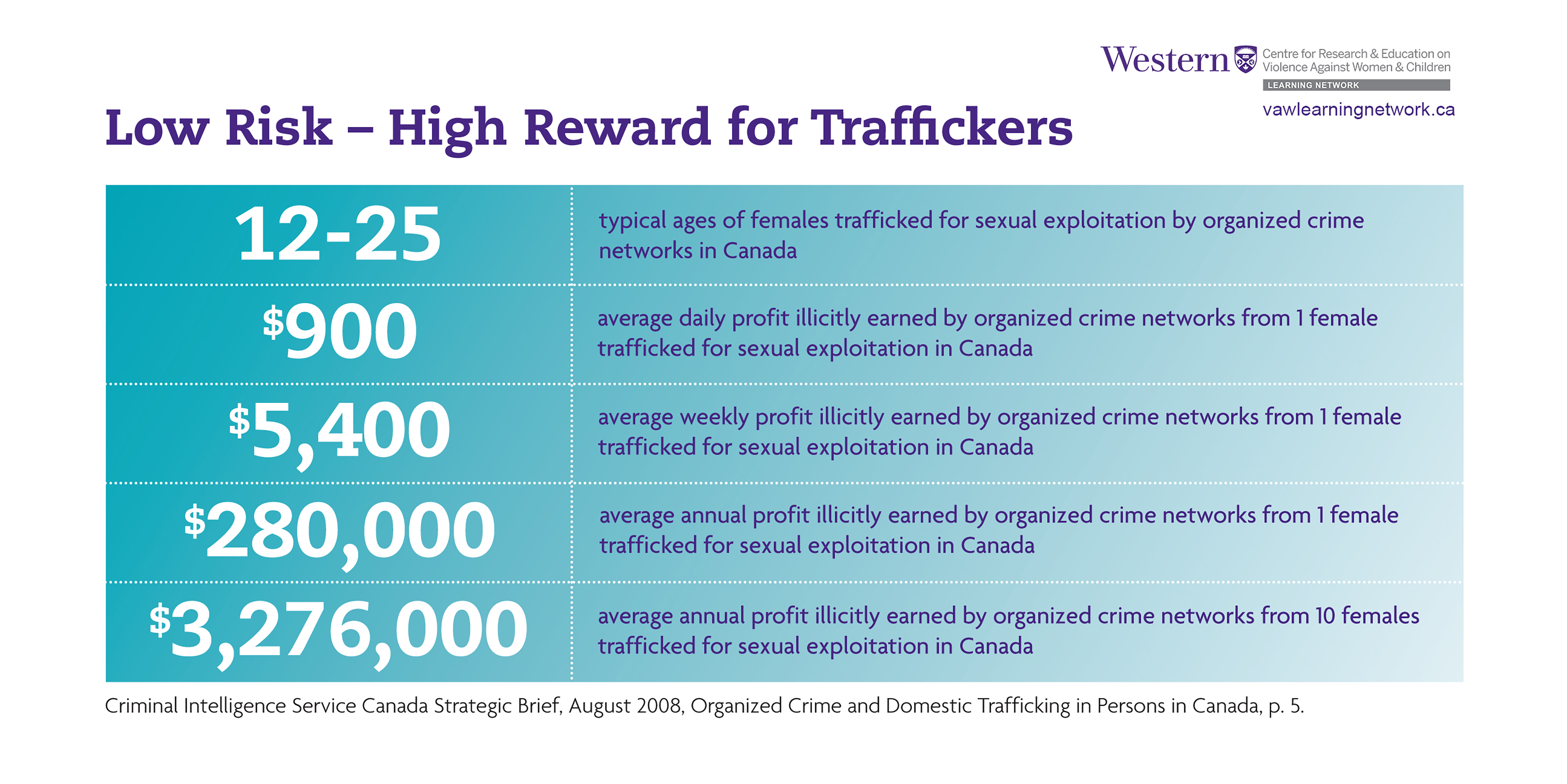 - $280,000 - average annual profit illicitly earned by organized crime networks from 1 female trafficked for sexual exploitation in Canada