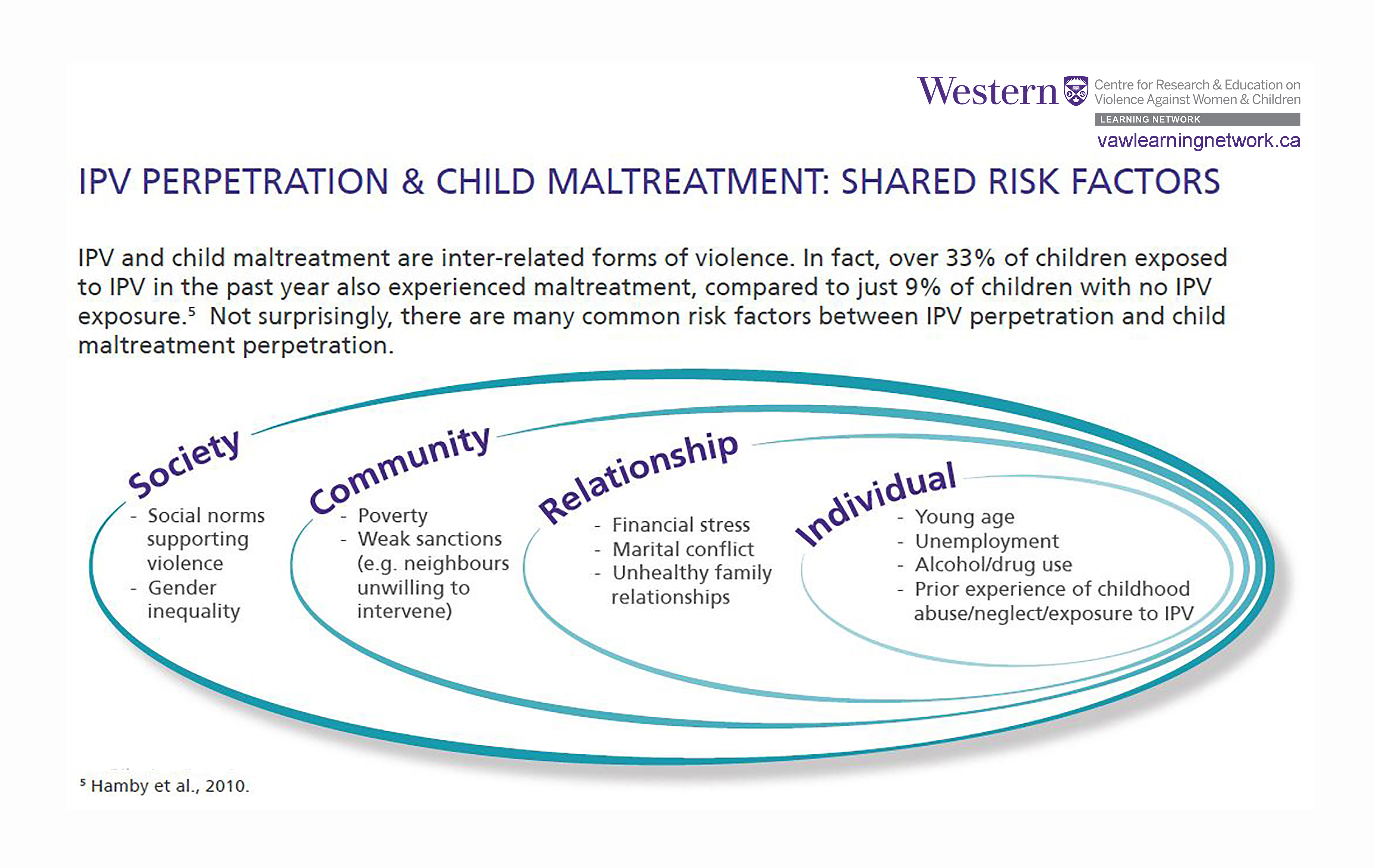 IPV and child maltreatment are inter-related forms of violence. In fact, over 33% of children exposed to IPV in the past year also experienced maltreatment, compared to just 9% of children with no IPV exposure.5. Not surprisingly, there are many common risk factors between IPV perpetration and child maltreatment perpetration.