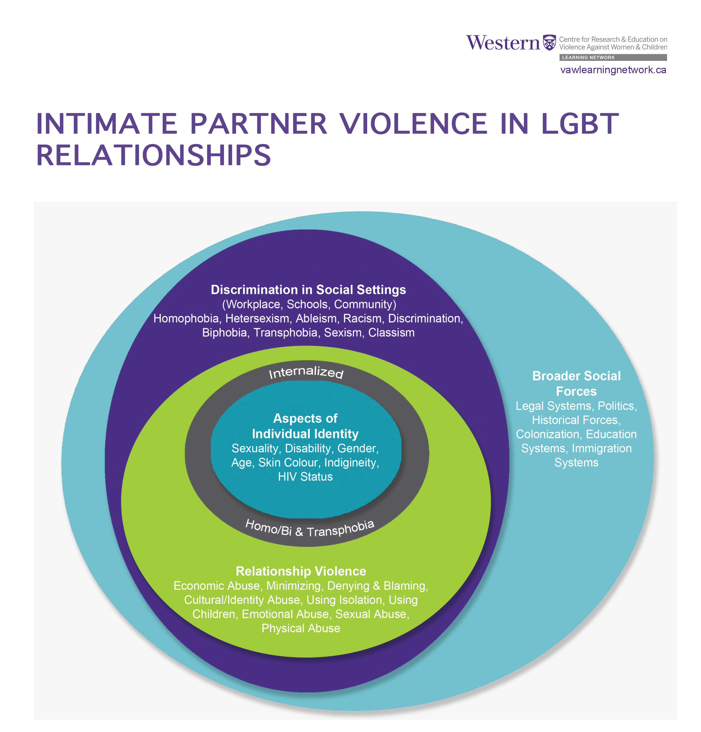 This infographic shows the multiple, compounding dimensions (including individual and social factors) that impact how LGBT people experience intimate partner violence.