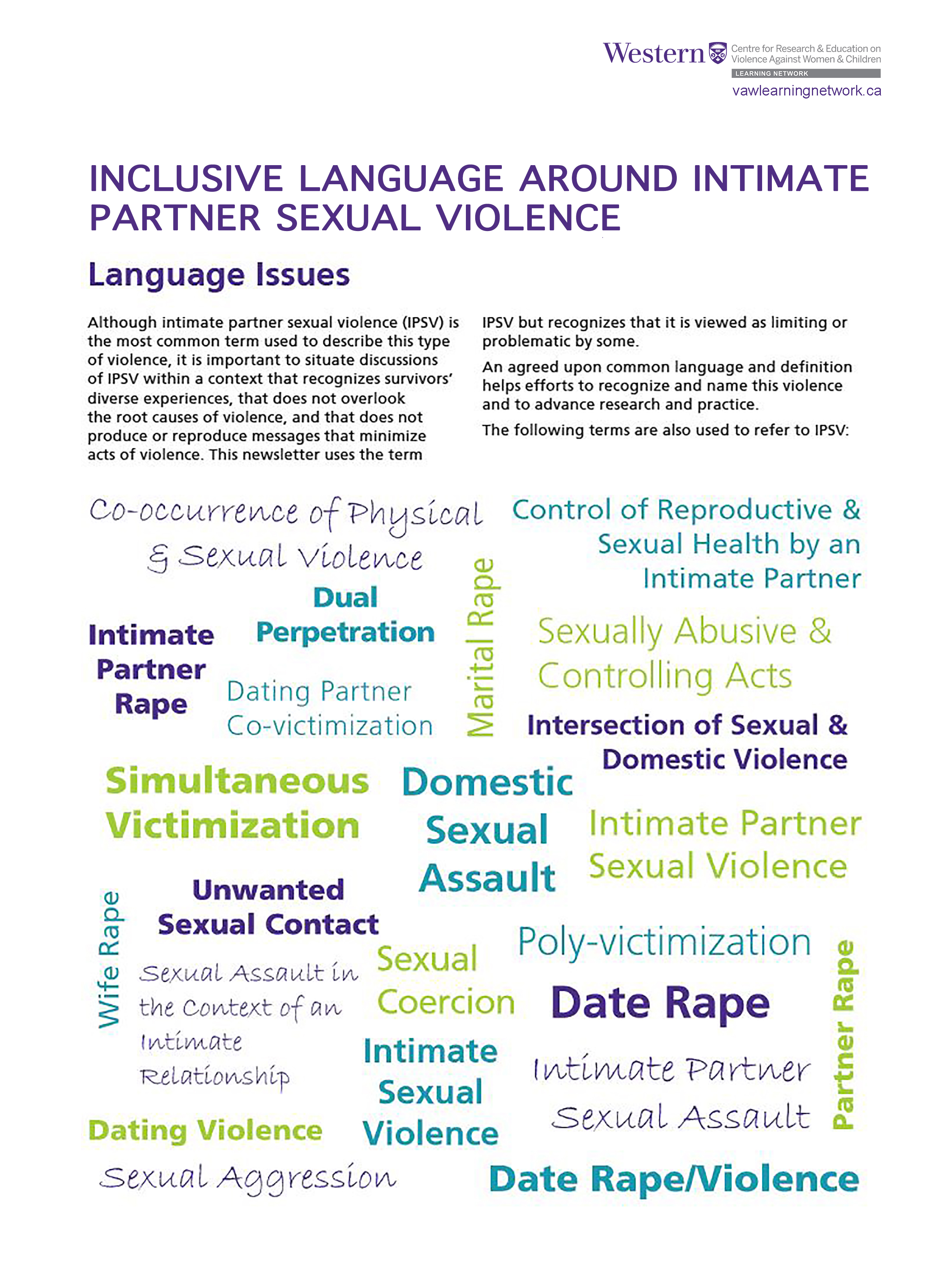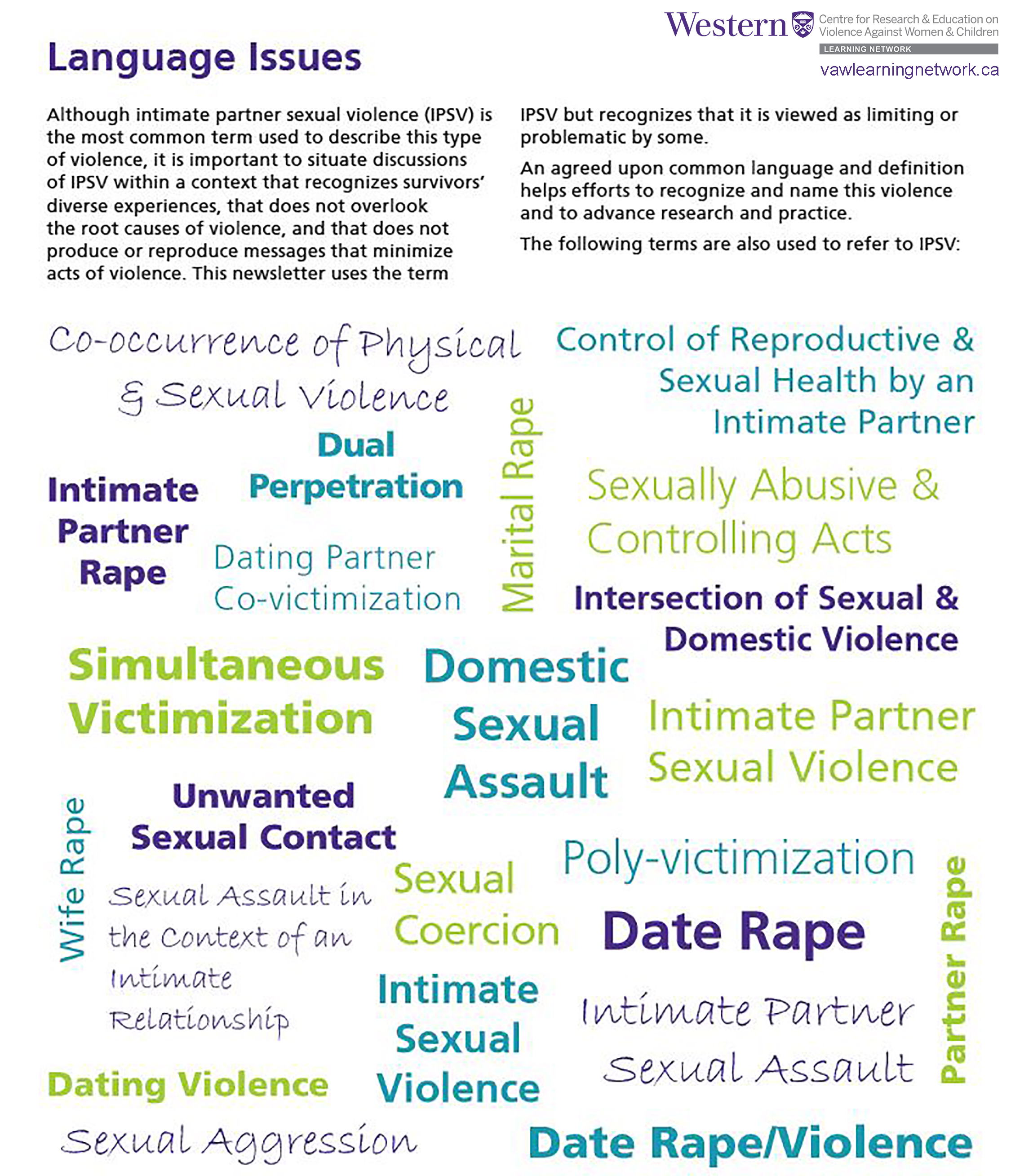 Although intimate partner sexual violence (IPSV) is the most common term used to describe this type of violence, it is important to situate discussions of IPSV within a context that recognizes survivors’ diverse experiences, that does not overlook the root causes of violence, and that does not produce or reproduce messages that minimize acts of violence. This newsletter uses the term IPSV but recognizes that it is viewed as limiting or problematic by some.