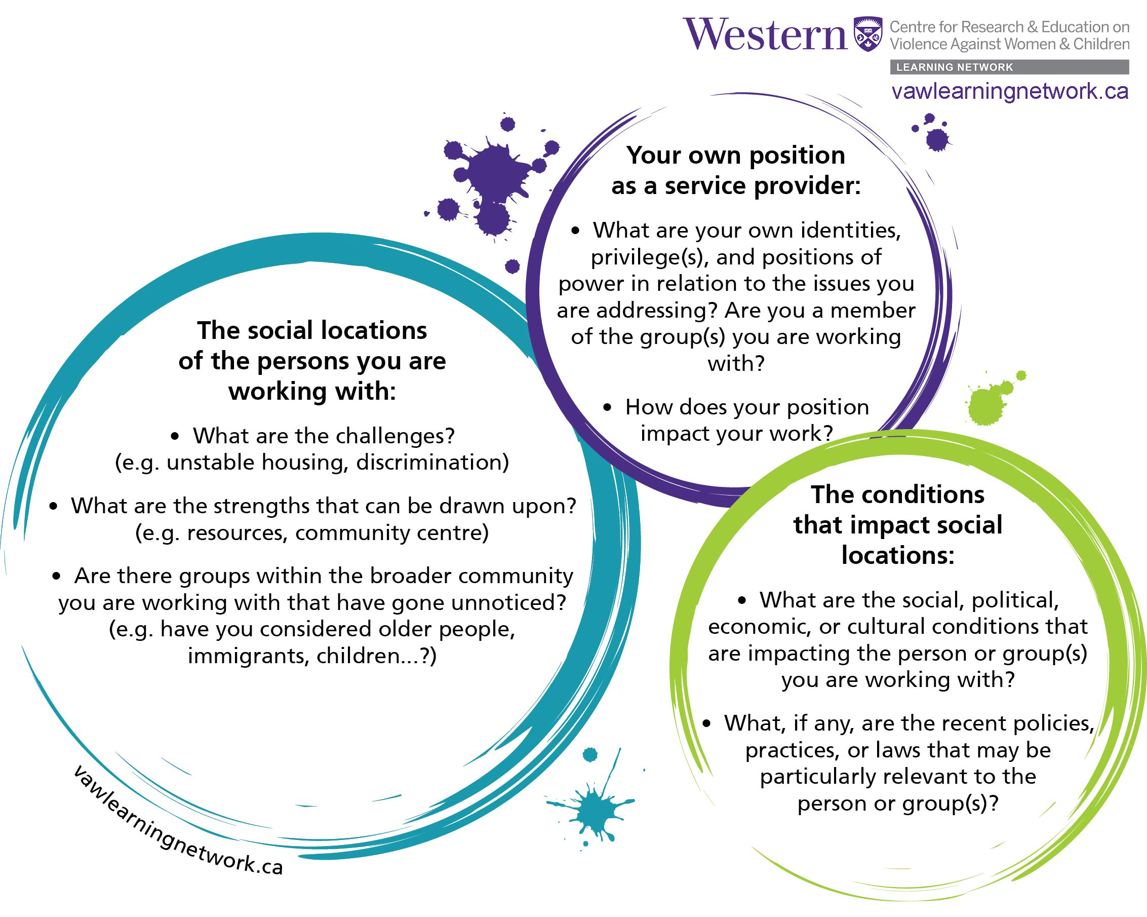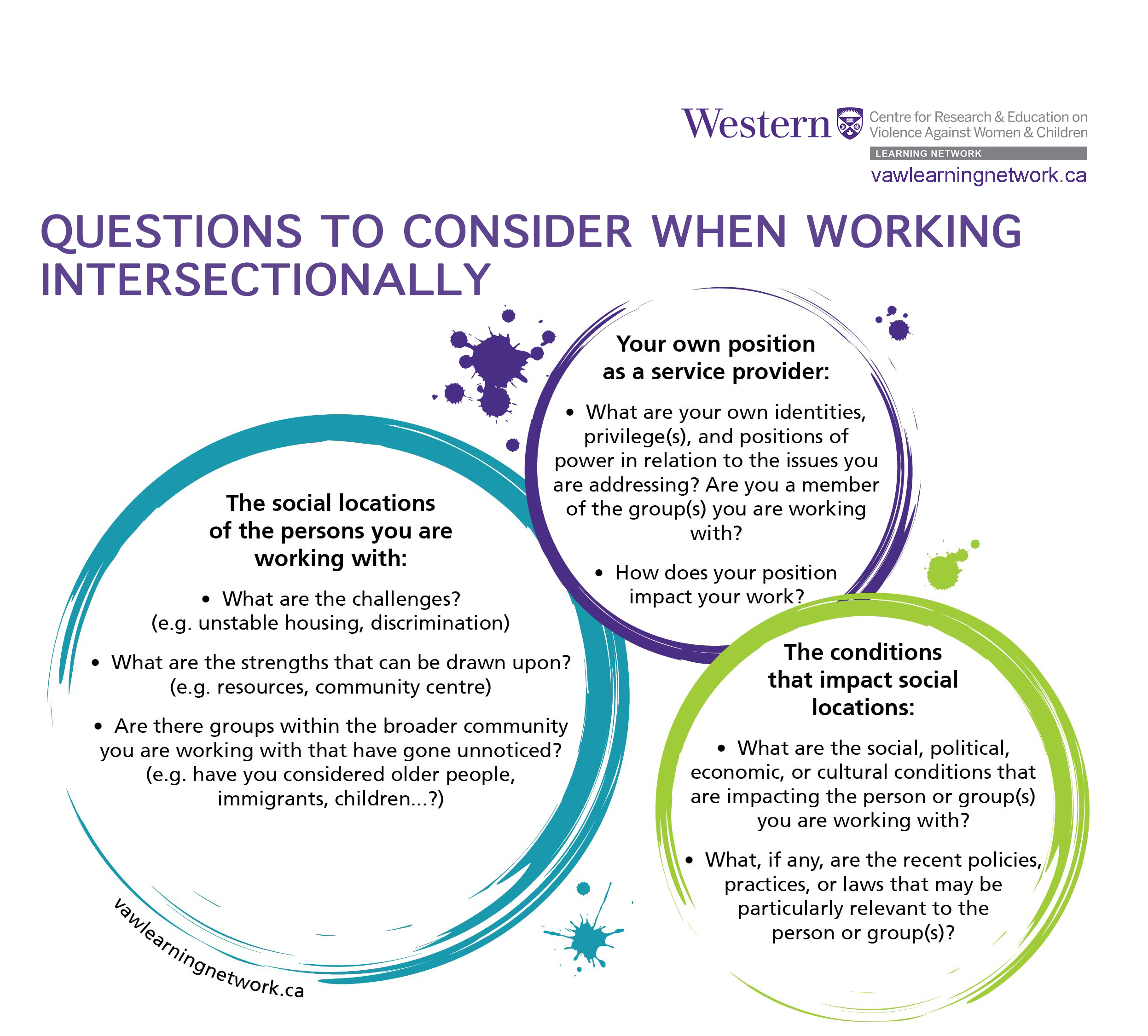 This inforgraphic provides contexual questions that can be asked when working with an intersectional approach.