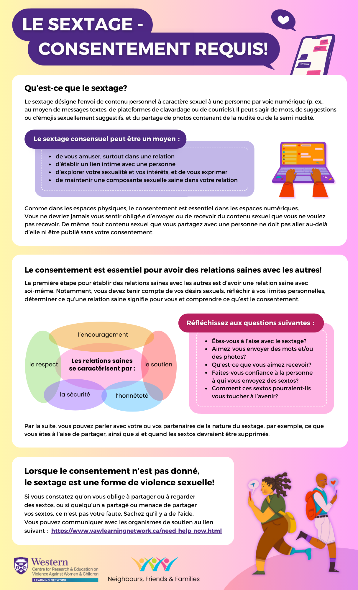 Cette infographie donne des informations sur l'importance du consentement dans le cas des sextos. Elle a été réalisée en partenariat avec Neighbours, Friends & Families.