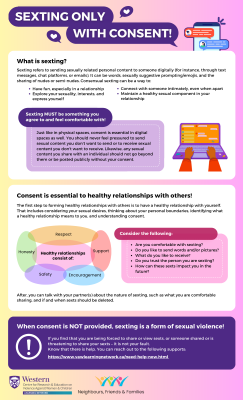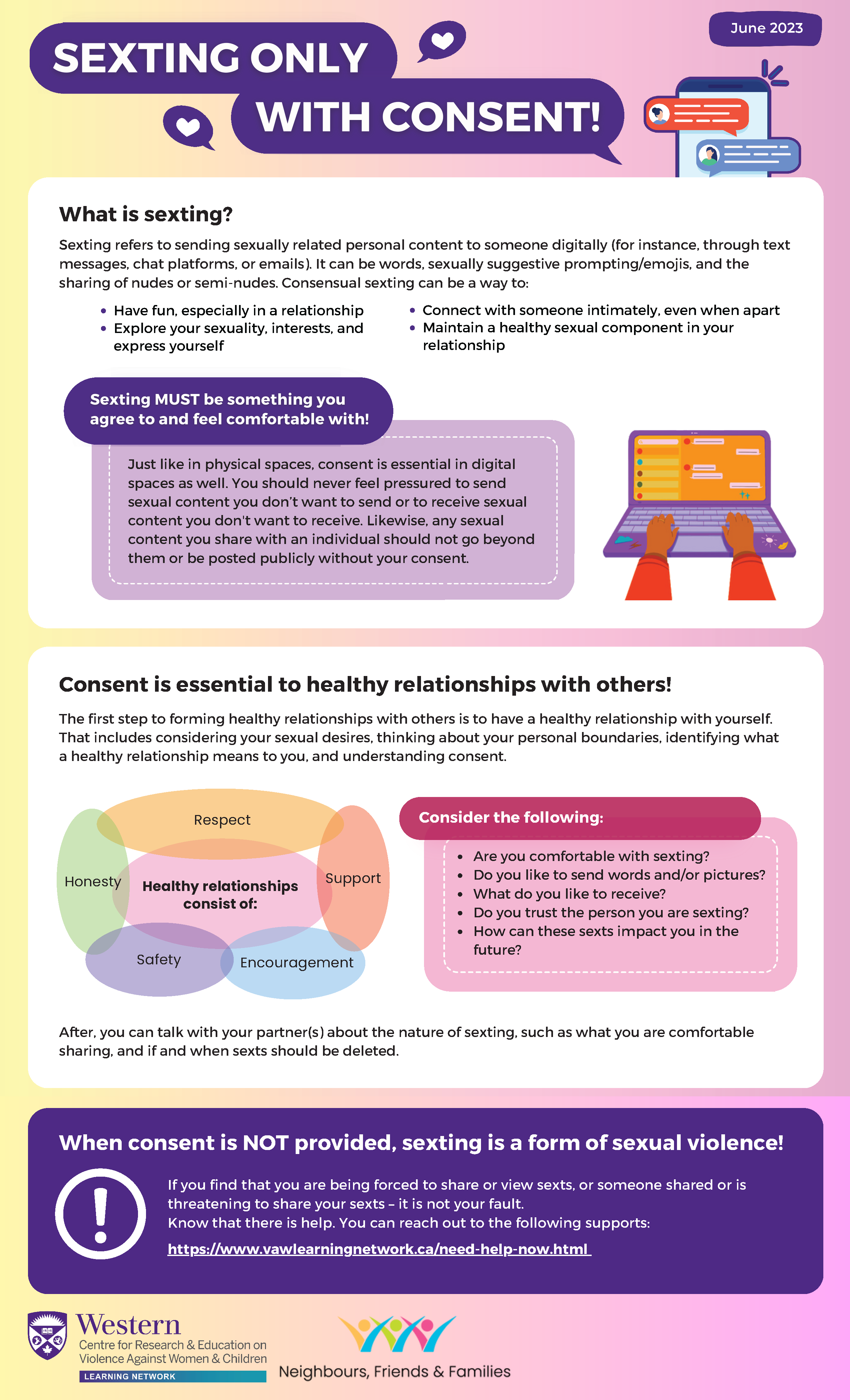 This infographic shares information about the importance of consent in sexting. It was made in partnership with Neighbours, Friends & Families.
