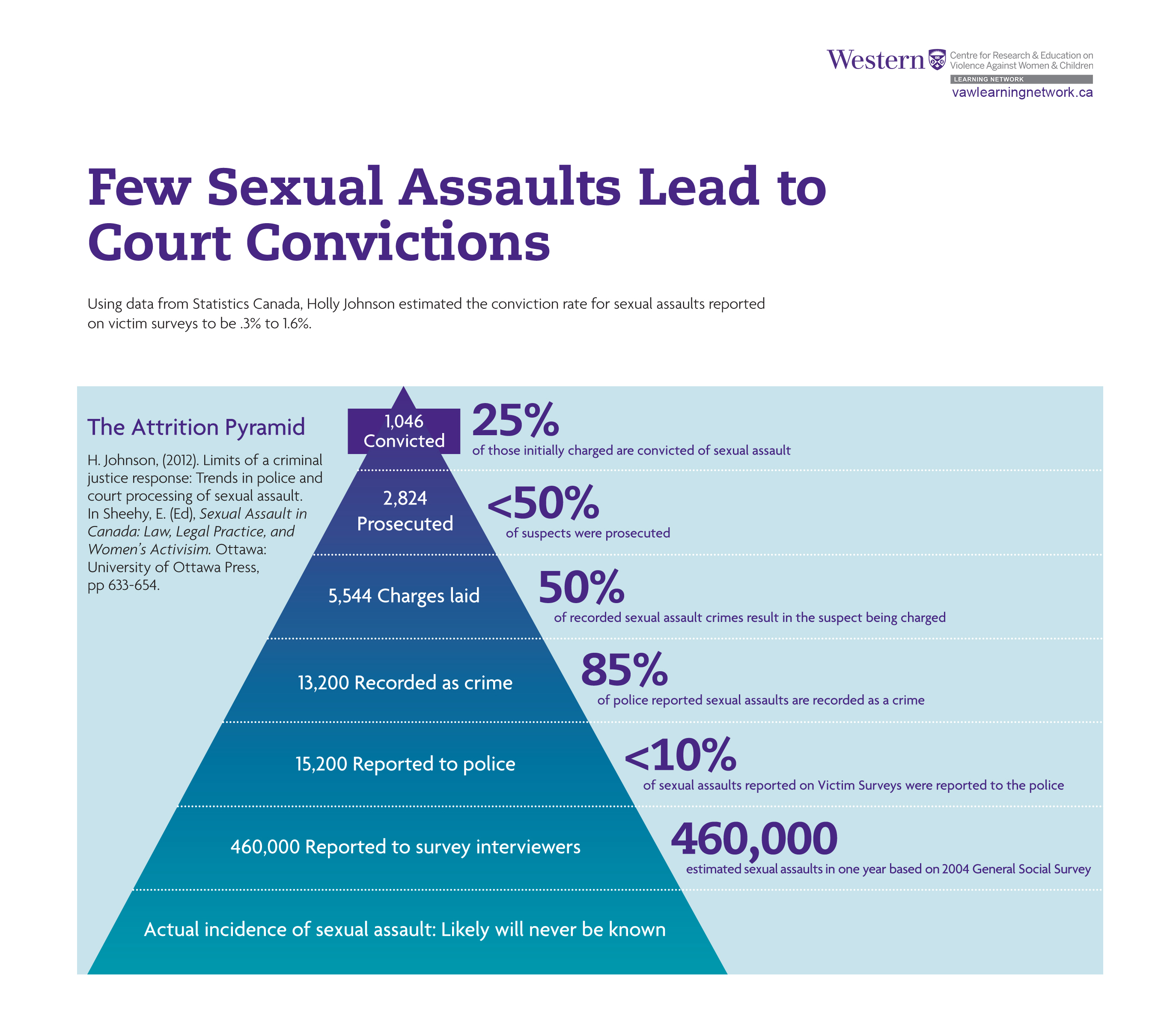 H. Johnson, (2012). Limits of a criminal justice response: Trends in police and court processing of sexual assault. In Sheehy, E. (Ed), Sexual Assault in Canada: Law, Legal Practice, and Women’s Activism. Ottawa: University of Ottawa Press, pp 633-654.- 1,046 Convicted - 25% of those initially charged are convicted of sexual assault