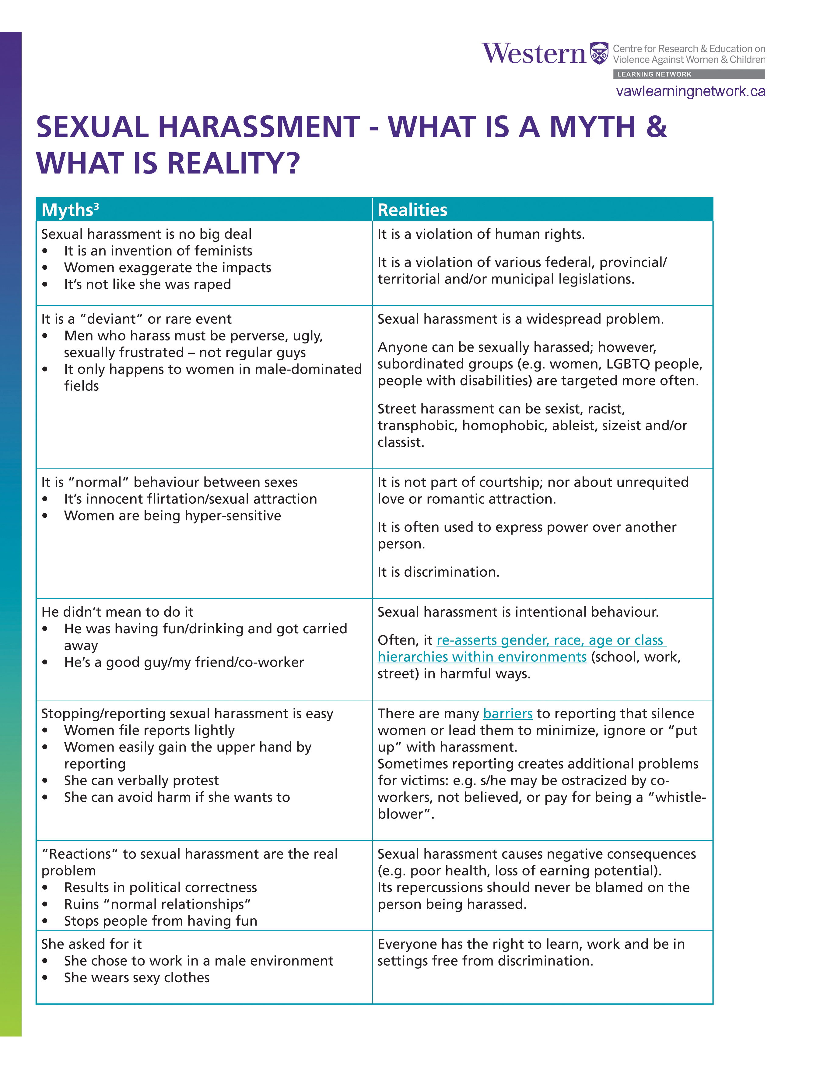 This infographic distinguishes commonly held myths from the realities of sexual harassment.