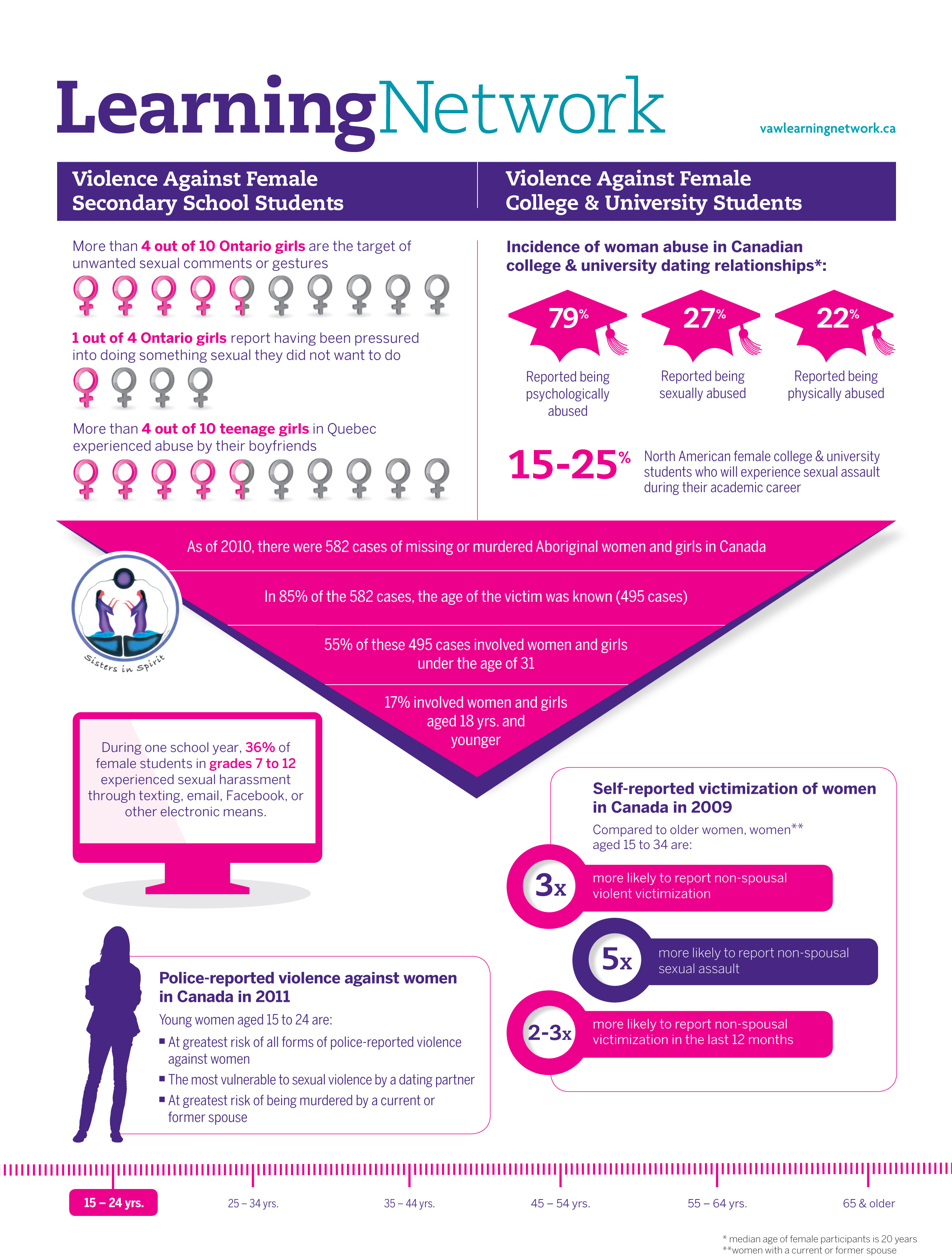 This infographic presents statistics on violence against women in secondary school, college, and university. It also compares rates of violence against women 15-34 to the rates experienced by older women.