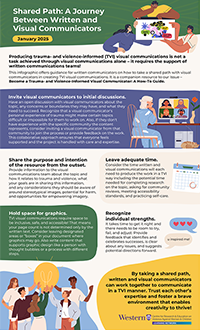 This infographic offers guidance for written communicators on how to take a shared path with visual communicators in creating TVI visual communications. It is a companion resource to our Issue – Become a Trauma- and Violence-Informed Visual Communicator: A How-To Guide.