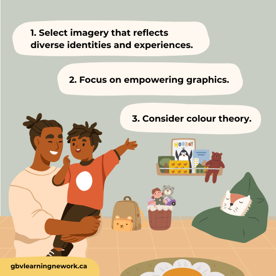 - Focus on incorporating images that empower and encourage. For example, a point within an infographic reads: “Recognize how coercive control is impacting children, while also attending to their experiences of fun and happier times.” Instead of showing an image of an upset child, you could use an image depicting an adult supporting the child by doing an activity together.