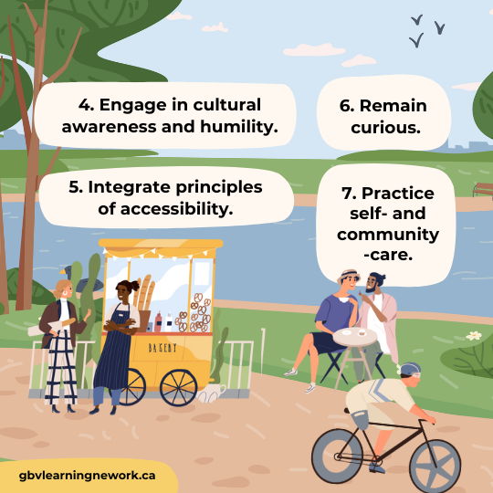 - Build and maintain partnerships. Engage people from different communities and sectors (e.g., health, legal, disability, shelter). By doing so, you can gain knowledge and better understand nuanced situations to support you in your work.